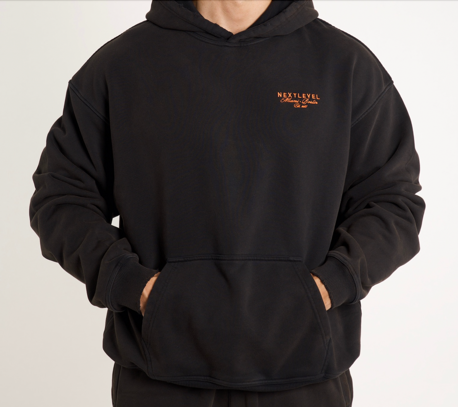 The NEXTLEVEL PREMIER Oversized Hoodie is built for bold moves. Made from ultra-heavy 485 GSM 100% cotton French Terry, it features a special custom acid wash with a rugged, burned effect and a signature distressed finish. The oversized fit, dropped shoulders, and kangaroo pocket combine style with function. Bold orange prints front and back make a statement for those who refuse to fit in and choose to stand out.